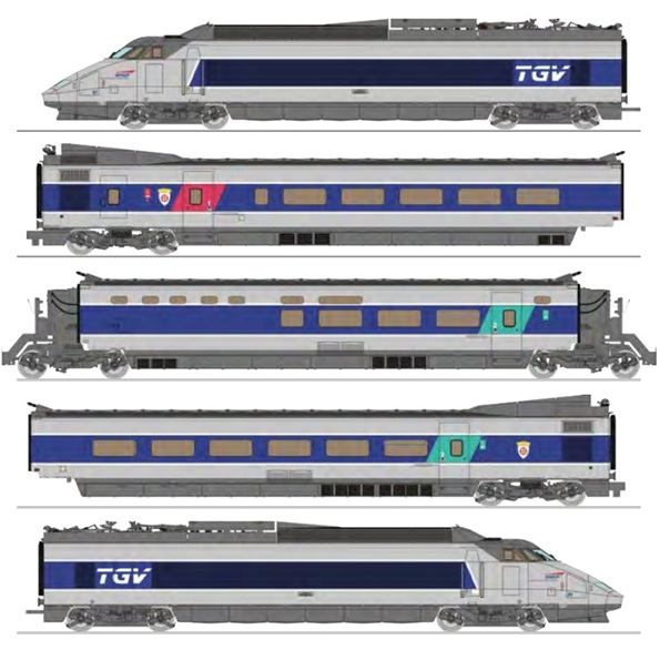 Coffret 5 éléments : 2 motrices + remorques R1 + R8 + R4 Bar TGV RENOV 1 Rame n°91 Suspensions pneumatiques SR10 livrée atlantique SNCF Ep. V-VI, Digital Son